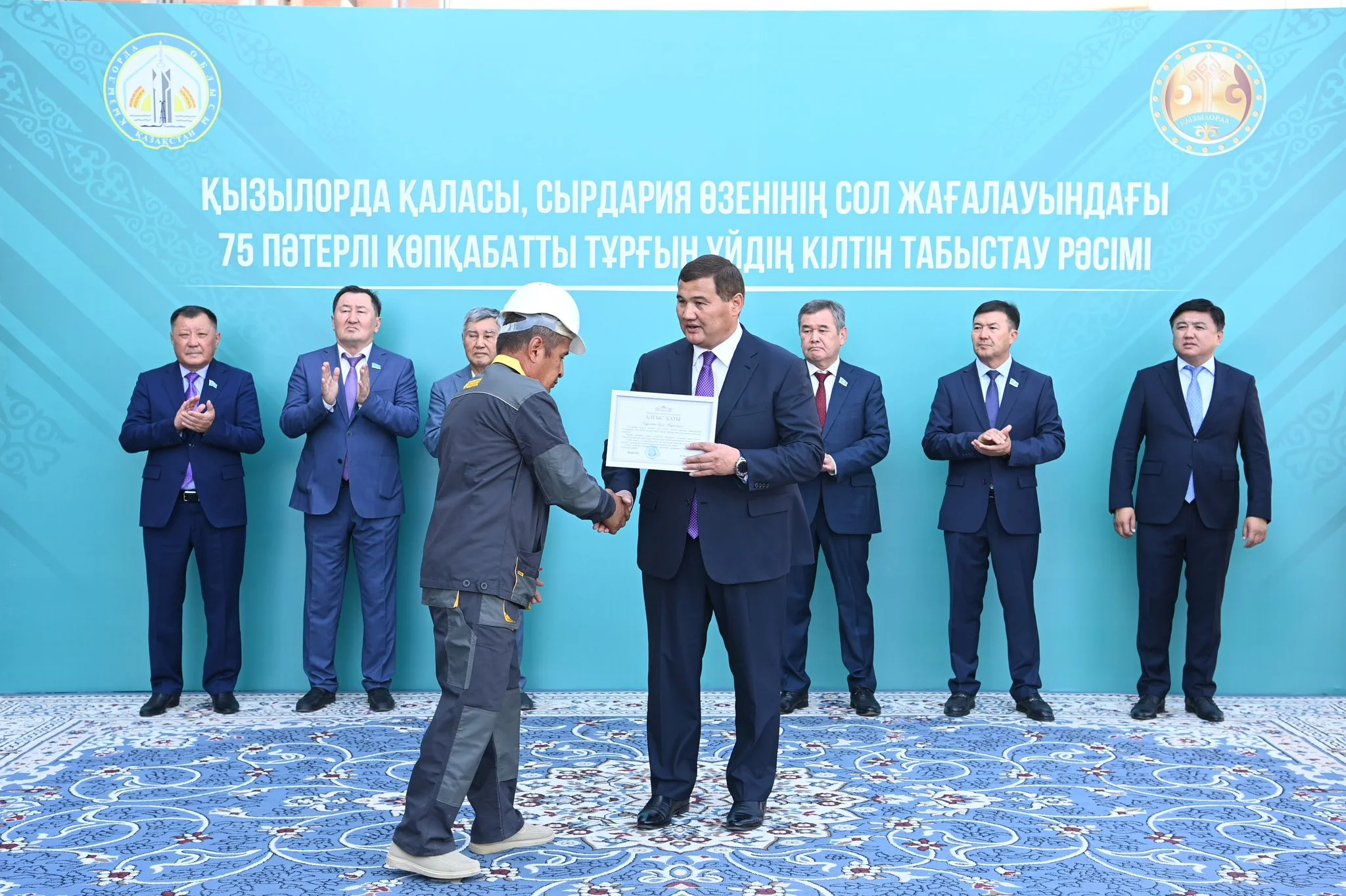 Рәсімде Наурызбай Байқадамов жаңа пәтер иелеріне құттықтауын жеткізіп, қоғам қайраткері Бақберген Досманбетов батасын берді. Сонымен қатар тұрғын үйді салған мамандар облыс әкімінің Алғыс хатымен марапатталды.