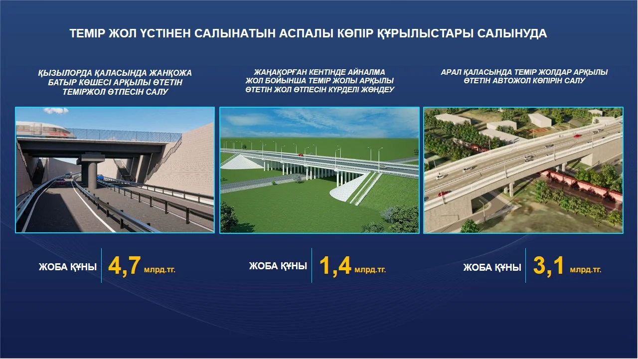 Қызылорда қаласында 4 млрд. 700 млн. теңгеге Жанқожа батыр көшесі арқылы өтетін теміржол асты автожолы, Арал, Жаңақорған аудандарында теміржол үстінен аспалы көпір құрылыстары жүруде.