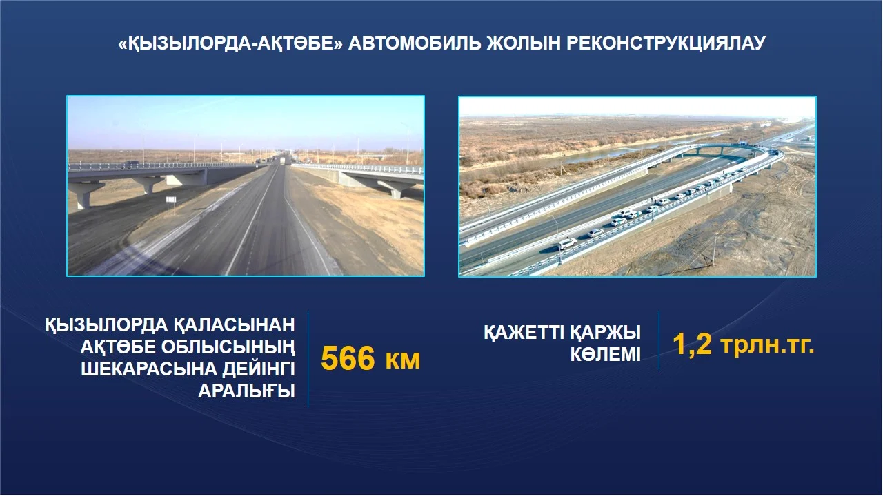 Айта кетейік, жылдар бойы күн тәртібінен түспеген «Қызылорда-Жезқазған» автожолы Президенттің тікелей тапсырмасымен қайта жаңғыртылуда. Жоба құны – 108 млрд. 500 млн теңге. Қызылорда облысының аумағына тиесілі 216 шақырым жолдың 140 шақырымы аяқталды. Қалған бөлігі 2026 жылы ел игілігіне беріледі.