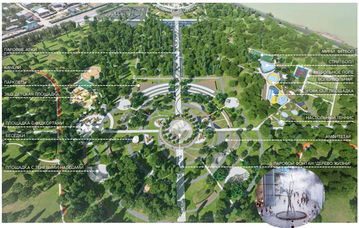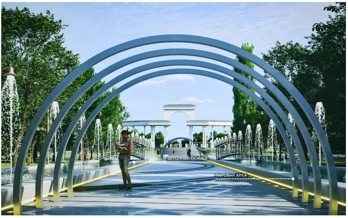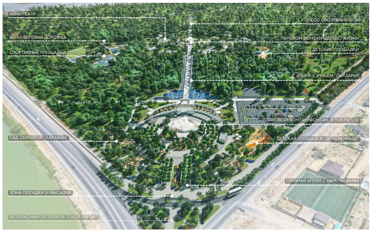 Сонымен қатар, саябақ арқылы өтетін барлық аллеялар мен тротуарлар бір - бірімен байланыстырылып, бұл маршрутты оңай және жылдам салуға, саябақтың дұрыс нүктесіне жетуге мүмкіндік береді. Вело-жүгіру жолы бүкіл саябақ арқылы шағын және үлкен шеңбер бойымен өтеді, жобада модульдік-санитарлық ғимаратын орналастыруға арналған алаңдар қарастырылған. Бақшада жасанды тоған, тоған үстіндегі көпір, стилистикалық ағаш беседка және демалуға арналған орындықтар бар. Мұнан өзге биіктікке өрмелеу нысаны, ойын құрылғылары, фитнеске арналған спорт қондырғылары, теннис корты, биіктігі 50 метрлік айналмалы дөңгелек аттракционы, балаларға арналған түрлі әткеншектер, тамақтану орындары, би алаңы, паркур, стритбол, сахна, сарқырама каналдары, канал үстінен көпірлер, бадминтон, шахмат, волейбол, баскетбол, футбол алаңдары, арқан саябағы, дария жағалауындағы жүргіншілер жолы, модульдік санитарлық ғимарат қарастырылған. Паркке ауыз су, кәріз су желілері тартылып, көркейту-көгалдандыру жұмыстары қоса жүргізіледі.